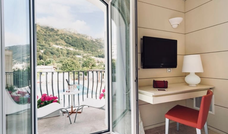2 ночи на острове Капри в роскошном отеле Villa Blu Capri***** : комфортные номера и роскошные удобства, бассейн с гидромассажем, по желанию — расслабляющие процедуры в wellness-зоне с сауной и турецкой баней.